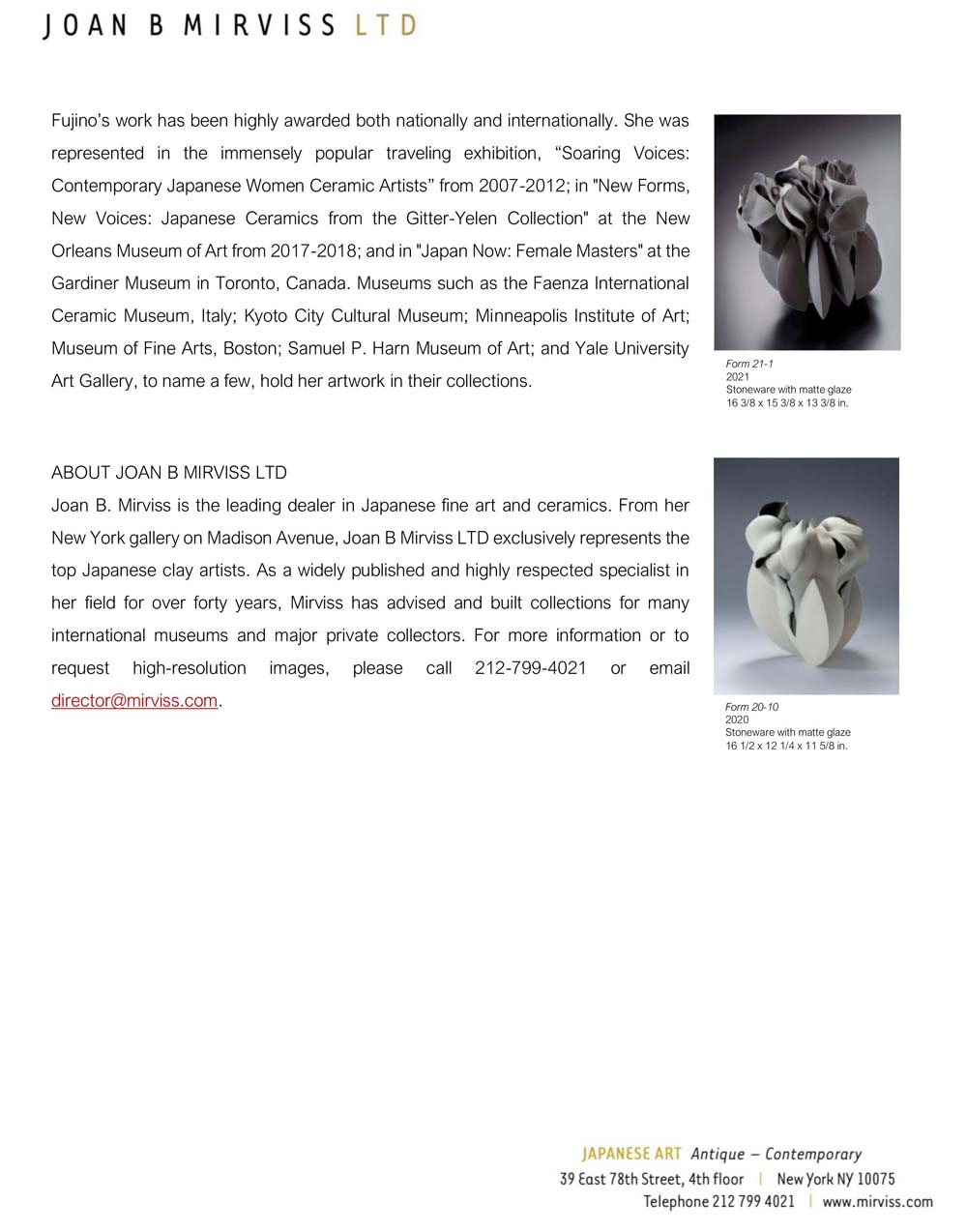 | ■ 個展/ Forming a Voice May-June 2021 Joan B Mirviss LTD (www.mirviss.com) release-1 release-2 |